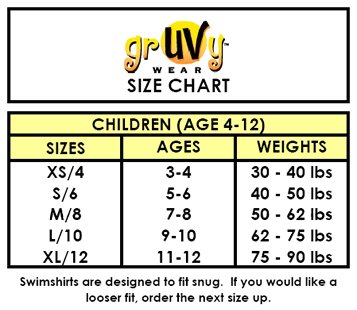 - Feature : Fashionable 2 piece set blocks out 99% of harmful UVA & UVB rays / Comfortable, worryfree all day protection, in and out of the water / Made in the USA with the highest quality standards / Lightweight & quick drying so can be worn both in and out of the water / Lycra nylon blend moves and stretches while protecting your child - (REVIEW grUVywear SIZE CHART to the left FOR BEST FIT)