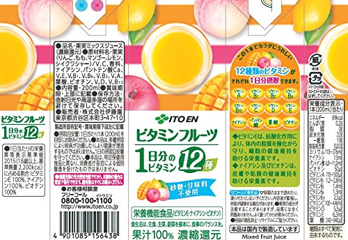 原材料:果実(りんご,もも,マンゴー,レモン,シークワーシャー)/香料,V.C,ナイアシン,パントテン酸Ca,V.E,V.B1,V.B6,V.B2,V.A,葉酸,ビオチン,V.D,V.B12