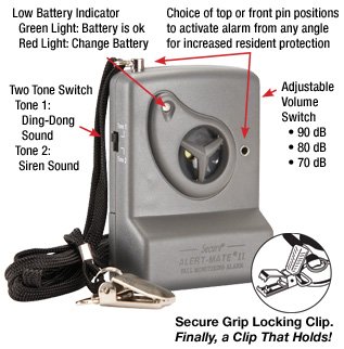 -. Feature : The Secure SAM-2 Alert-Mate Alarm Monitor helps prevent patient falls and wandering by alerting caregiver when a bed or chair exit attempt is made - Alarm is always on for patient safety / Adjustable volume control (70, 80, 90 dB) / Two pull pin position options (front or top) for easy release of pull pin in various mounted positions / Alarm attaches to flat surface, such as a wall or headboard, using included Velcro strip or can be mounted on a wheelchair or bed frame using the included AMH-1 holster with attachment strap / Low battery indicator light - Battery and Velcro attachment strip included - One year warranty