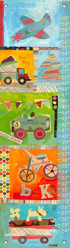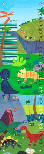 Children's growth chart featuring different types of dinosaurs. The dinosaurs are labeled so it makes it educational too. Our kid's growth charts are created on the same artists canvas as our stretched wall art. Grommets placed in the four corners make them easy to hang. We provide color coordinated decorative covers that easily fit over the screw or nail you choose. This product creates a great childhood keepsake, and rolls up easily for safe storage. The growth chart can be wiped clean with a soft, dry or slightly damp cloth and should it wrinkle, the backside may be ironed on a low setting with light steam. A permanent marker (not included) is a great way to mark dates or ages on the chart.Feature
