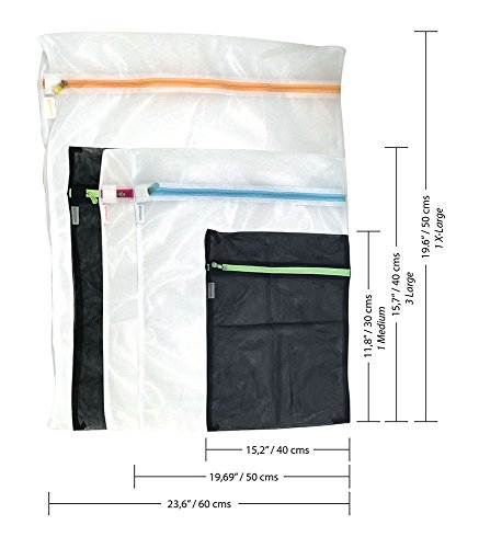- MULTIPLE SIZES FOR ALL YOUR WASHING NEEDS -- If you wear DDD or own extra large bra cups have no fear they will fit into the extra large washing bag. Teeny tiny baby socks, delicate hosiery and bathing suits can fit into the medium size bags. Sweaty gym shoes, pijamas and sweaters can now easily be washed separately then go straight into the dryer. Specifications: 1 Extra Large White 23.6" x 19.6" (60 x 50 cms) 3 Large, 2 White and 1 Black19.6" x 15.7" 50 x 40) 1 Medium 15.2" x 11.8" (40x30cms)