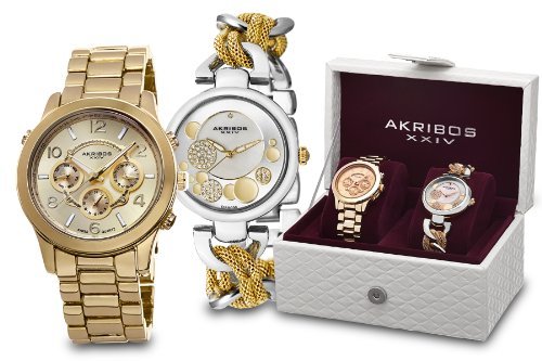 AK648: yellow gold tone steel case AK643: stainless steel case. AK648: yellow gold tone steel bracelet AK643 two tone stee bracelet. Fixed bezel. AK648: gold tone AK643: silver and gold dial with luminous hands. AK648: alternating arabic and index. Dial Type: Analog. Three - day of the week, date and 24 hour. Quartz movement. Scratch resistant mineral crystal. Pull / push crown. Case diameter: 40 mm. Round case shape. Water resistant at 10 meters / 33 feet. Functions: hour, minute, second, calendar, 24 hour. Additional Info: AK648: deployant clasp with push buttons. AK643: jewelry clasp. Akribos XXIV Two Tone Watch Set AK676YG.