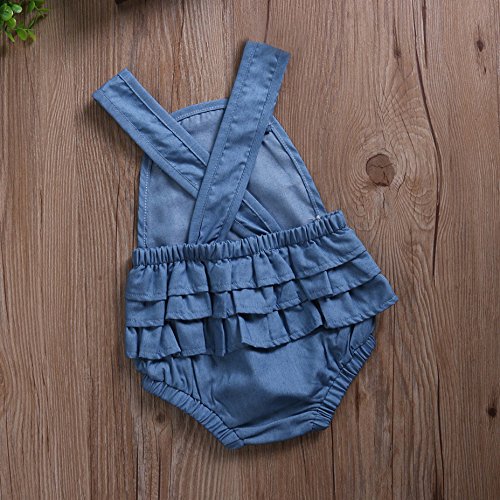 -. Title : Baby Girls Denim Color Cross Back Ruffle Romper Button Backless Bodysuit