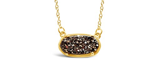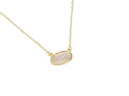 This 100% natural druzy gemstone necklace features a 0.5" x 0.2" oval shaped druzy quartz pendant set within a gold plated case and dangling elegantly from an 18" gold plated chain with easy-to-close lobster claw clasp. Our one of a kind druzy pendants make beautiful statement pieces while remaining comfortable to wear. You are sure to catch the eye of many while you wear your natural drusy stone necklace!