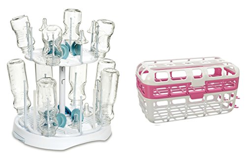 -. Feature : Holds up to 16 bottles and ideal for use on valves, straws, nipples, pump accessories, pacifiers and more / Height adjust to fit multiple size bottles and cups; Pegs fold down flat for custom set-up and easy storage / Base features cut-away grips for easy handling; Reversible drip tray can be set to either catch water or drain into sink / Extra-large baby dishwasher basket accommodates both standard and wide mouth bottles; Easily squeeze and slide nipples into place - no need to open top lid to load and unload / Large lower basket holds collars, valves, spouts and other small bottle and sippy cup accessories; Includes straw rack plus special area for holding and cleaning pacifiers; Use in top rack of dishwasher only