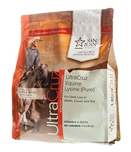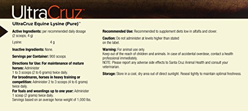 -. Binding : Misc. -. Brand : UltraCruz -. EAN : 0810500022521 -. Feature : Helps improve the quality and availability of protein in the horses diet / Lysine has been shown to support an increase in muscle mass / Helps to reduce anxiety levels / Provides an essential amino acid often absent from an equine diet / Supplied as a 4 lb bag -. Label : UltraCruz -. Manufacturer : UltraCruz -. MPN : C632529 -. PackageQuantity : 1 -. PartNumber : C632529 -. ProductGroup : Pet Products -. ProductTypeName : PET_SUPPLIES -. Publisher : UltraCruz -. Size : 4 lbs. -. Studio : UltraCruz -. Title : UltraCruz Horse Pure Lysine Supplement, 4 lbs. -. UPC : 810500022521
