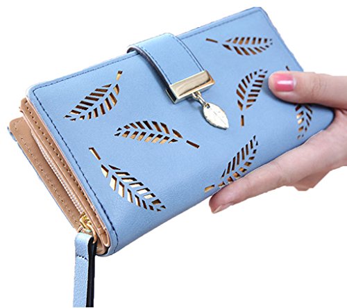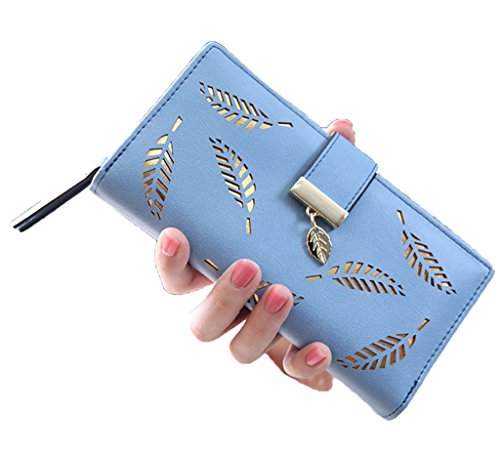 Name: Hollow leaf wallet Material: PU Inside Material: Polyester Capacity: you can put 10,000 yuan capacity Open the way: buttons Product Size: Length: 19cm Width: 3.2cm Height: 10cm wallet discount: 2 fold Color: pink, beige, blue, black, brown Internal structure: Card position: 11 Big note: 3 Camera chip: 1 coin pocket: 2 Use: card package, wallet, purse 0