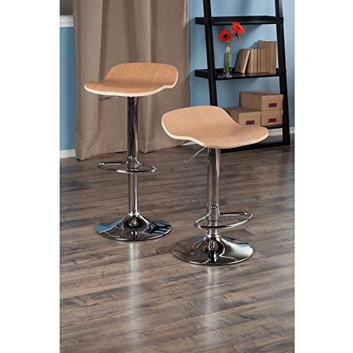 -. Feature : Set of 2 stools with casual, modern design / Ideal for use in kitchen and dining area / MDF veneer seat, durable metal frame / Adjustable height for any size counter / Chrome-finished frame and choice of seat colors