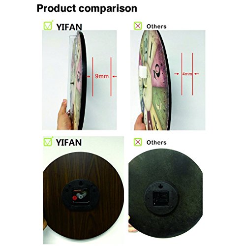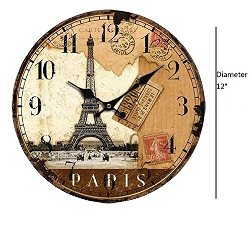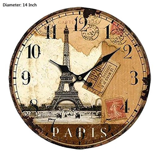 -. Brand : Yifan -. Feature : .This clock is made of wooden, has a vintage look but modern "works" / .Material: Wooden MDF, covered by waterproof and damp proof coated Paper / .Large and bold Arabic Numeral Design / .Movement: Taiwan Sangtai 12888 Scanning Quartz Movement, more quiet / .Try hanging it in your kitchen for a vivid addition or place it in your home office to inspire an vintage atmosphere -. ProductGroup : Home Improvement -. ProductTypeName : HOME_ORGANIZERS_AND_STORAGE -. Title : 14 Inch Vintage France Paris Eiffel Tower Arabic Numerals Design Silent Wooden Wall Clock