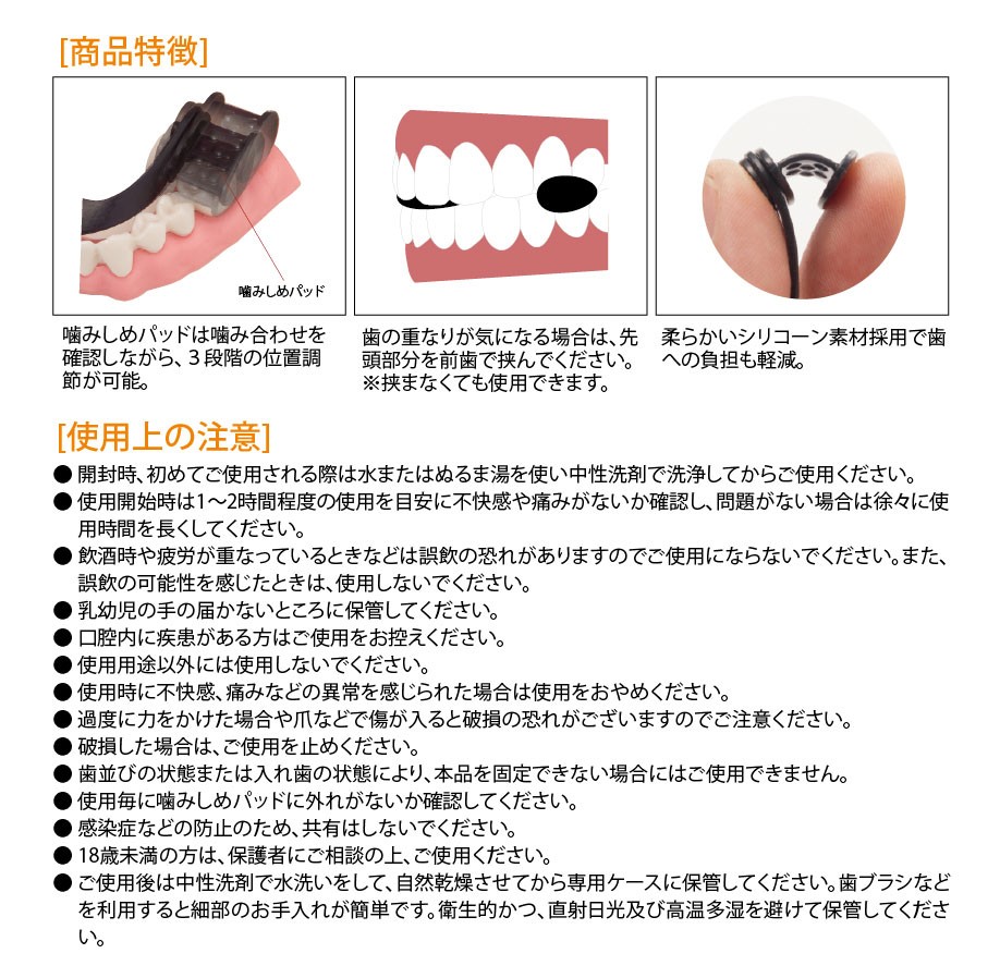 | ご使用上のご注意 | ●開封時、初めてご使用される際は水またはぬるま湯を使い中性洗剤で洗浄してからご使用ください。 ●使用開始時は1~2時間程度の使用を目安に不快感や痛みがないか確認し、問題がない場合は徐々に使用時間を長くしてください ●飲酒時や疲労が重なっているときなどは誤飲の恐れがありますのでご使用にならないでください。また、誤飲の可能性を感じたときは、使用しないでください。 ●乳幼児の手の届かないところに保管してください。 ●口腔内に疾患がある方はご使用をお控えください。 ●使用用途以外には使用しないでください。 ●使用時に不快感、痛みなどの異常を感じられた場合は使用をおやめください。 ●過度に力をかけた場合や爪などで傷が入ると破損の恐れがございますのでご注意ください。 ●破損した場合はご使用を止めください。 ●歯並びの状態または入れ歯の状態により、本品を固定できない場合にはご使用できません。 ●使用毎に噛みしめパッドに外れがないか確認してください ●感染症などの防止のため、共有はしないでください。 ●18歳未満の方は、保護者にご相談の上ご使用ください。 ●ご使用後は中性洗剤で水洗いをして、自然乾燥させてから専用ケースに保管してください。歯ブラシなどを利用すると細部のお手入れが簡単です。衛生的かつ、直射日光及び高温多湿を避けて保管してください。 |