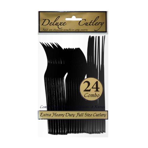Party Essentials N1224BK Deluxe Plastic Full Size Extra Heavy Duty Cutlery, Black (8 Packs of 24)