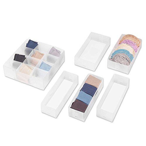 -. Binding : Kitchen -. Brand : Whitmor -. Color : Clear -. EAN : 0615264033437 -. Feature : 2 small square boxes measures 3" L x 3" W x 2" H / 1 small rectangle box measures 6.25" L x 3" W x 2" H / 1 medium rectangle box measures 9.63" L x 3" W x 2" H / 1 large rectangle box measures 12.88" L x 3" W x 2" H / 1 large square box measures 6.38" L x 6.38" W x 2" H -. IsAutographed : 0 -. Label : Whitmor -. Manufacturer : Whitmor -. Model : 1044684396 -. MPN : 1044684396 -. PartNumber : 1044684396 -. ProductGroup : Home -. ProductTypeName : HOME -. Publisher : Whitmor -. Size : Small, Medium, Large -. Studio : Whitmor -. Title : Clear Whitmor 6-Piece Drawer Organizer Set -. UPC : 615264033437