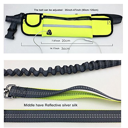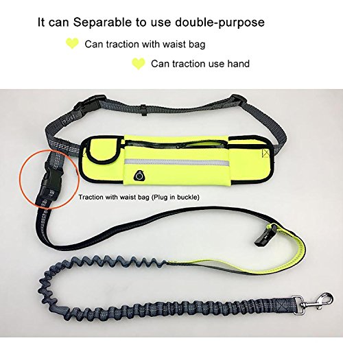 ★ HAND-FREE TO TRACTION- The reflective waist bag very converience to put goods when outside.Like mobile,moey,key and so on. • With the Adjustable Waistband and built in Shock Absorbing Bungee, our Hands Free Leash is a much more comfortable way to enjoy your walks or runs