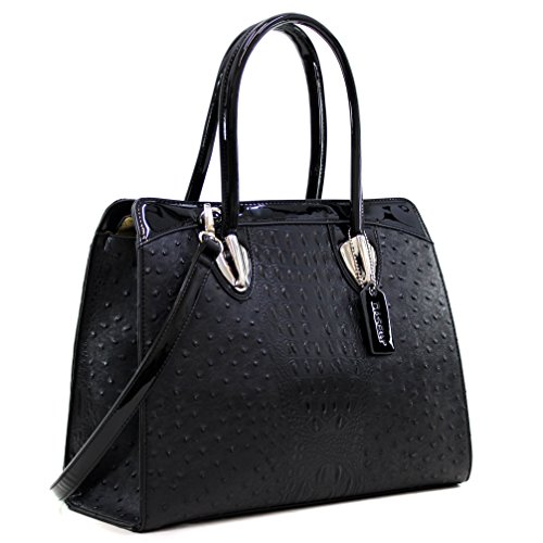 [Materials]: Made of high quality faux ostrich leather with faux patent leather trim; Signatured fabric lining in light color to make finding things easier; Silver tone hardware