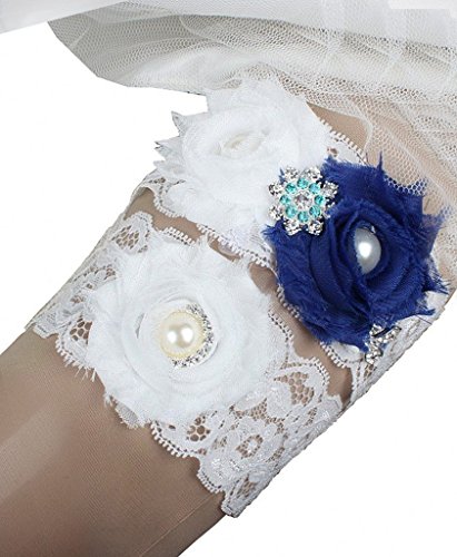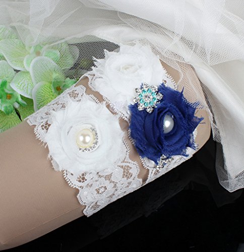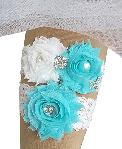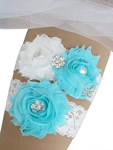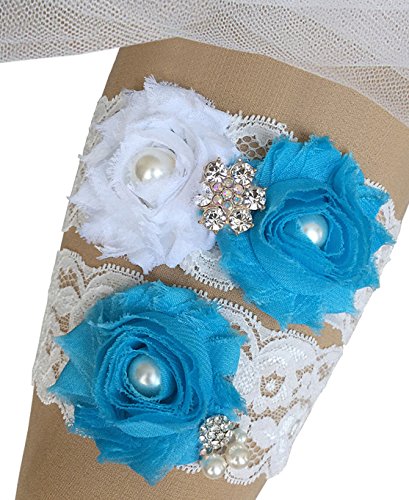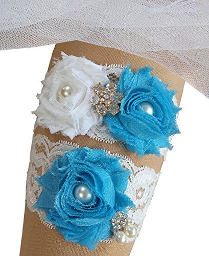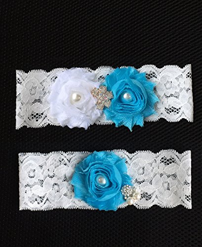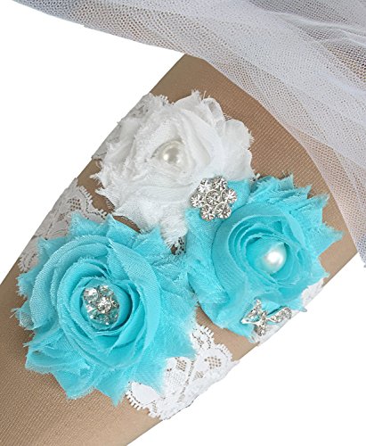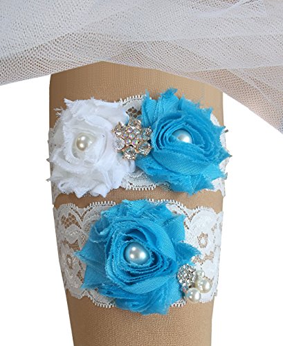 MerryJuly Lace Wedding Bridal Garter Set with Rhinestones (XL(20-25 inch), White/Turquoise)