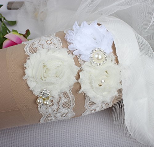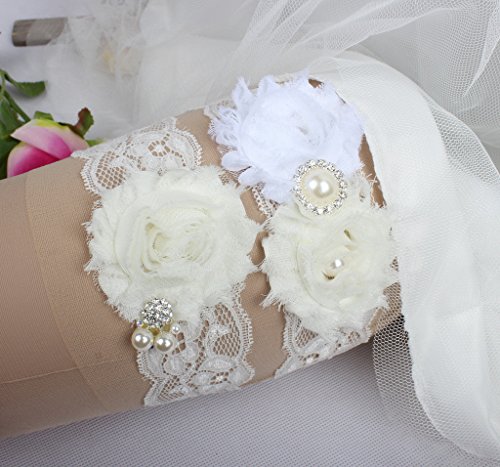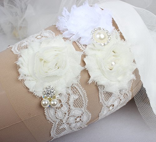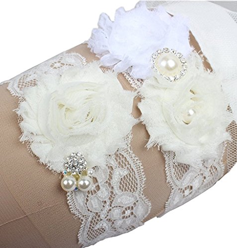 MerryJuly Bridal Garter set Lace with Rhinestones Wedding Garters for Bride White Ivory Size M