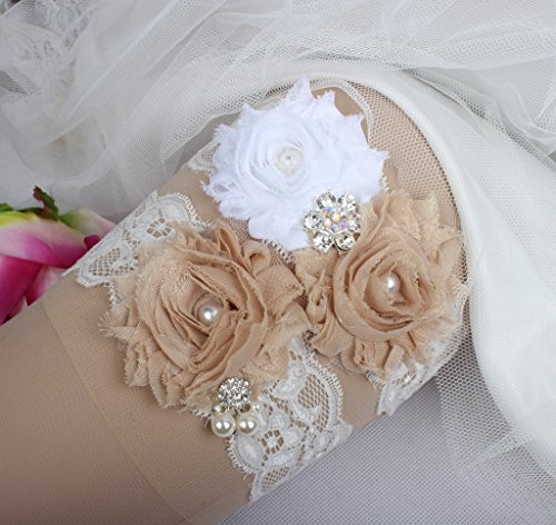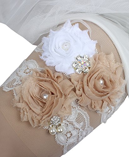MerryJuly Bridal Garter set Lace with Rhinestones Wedding Garters for Bride Champagne Size XL