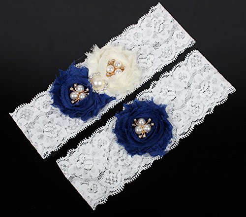 MerryJuly Bridal Garter set Lace with Rhinestones Wedding Garters for Bride Dark Blue Size M