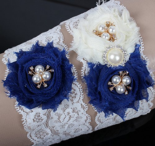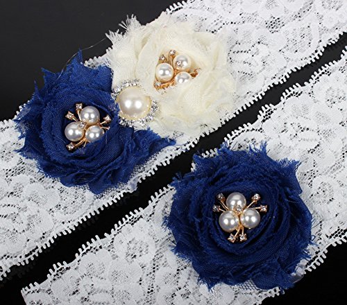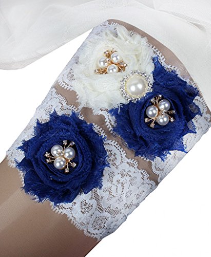 MerryJuly Bridal Garter set Lace with Rhinestones Wedding Garters for Bride Dark Blue Size L