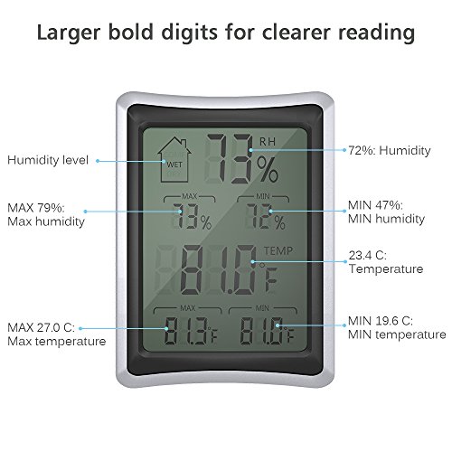 【THERMO-HYGROMETER MONITOR】It has important skin, allergen and other health benefits to ensure ideal indoor thermometer and humidity control in living room, bedroom and office. The Indoor Thermometer&Hygrometer Monitor accurately displays High/Low for both temperature and humidity.