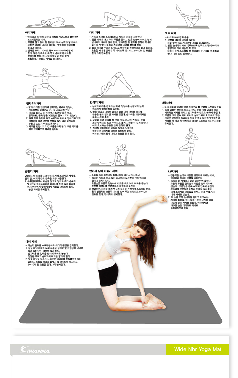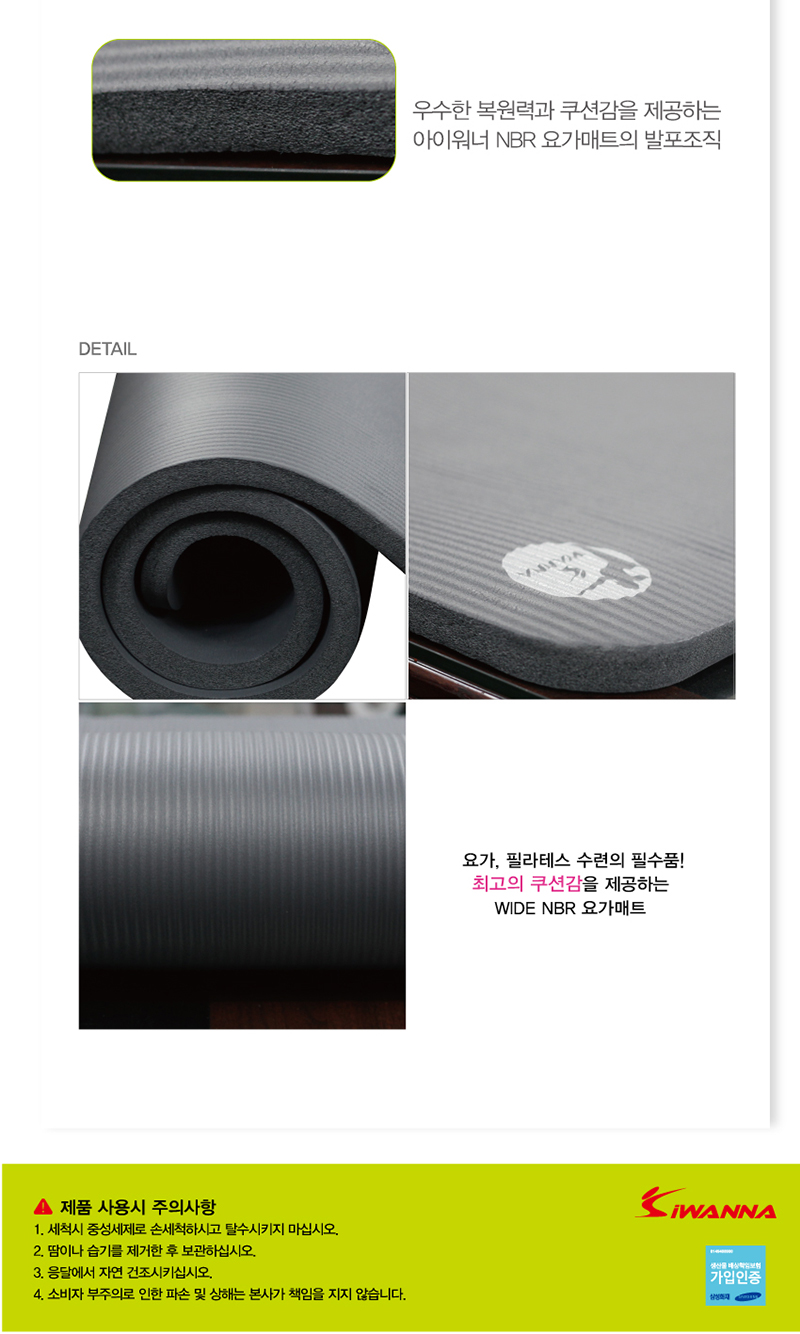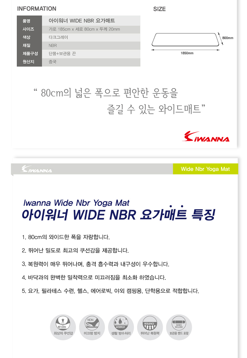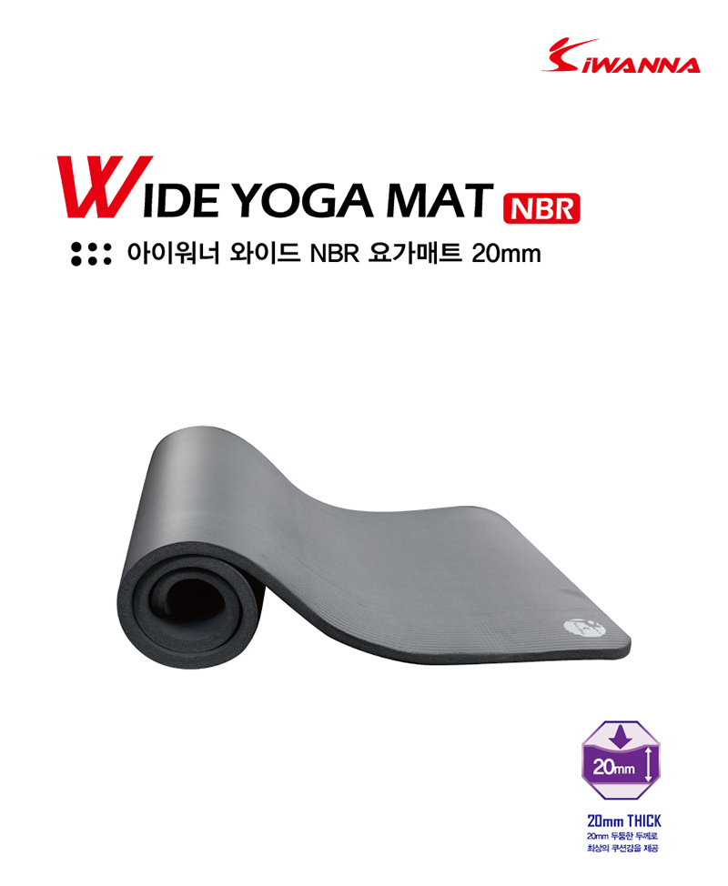 아이워너 와이드 NBR 요가매트 20mm 다크그레이1) 80cm의 넓은 폭을 자랑합니다.2) 뛰어난 밀도로 쿠션감을 제공합니다.3) 복원력이 매우 뛰어나며, 충격 흡수력과 내구성이 우수합니다.4) 바닥과의 완벽한 밀착력으로 미끄러짐을 최소화 하였습니다.5) 요가,필라테스 수련,헬스,에어로빅,야외캠핑용,단학용으로 적합합니다.제품 구성품 : 아이워너 WIDE NBR 요가매트 20mm + 보관용 끈