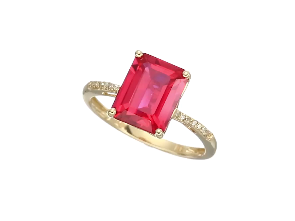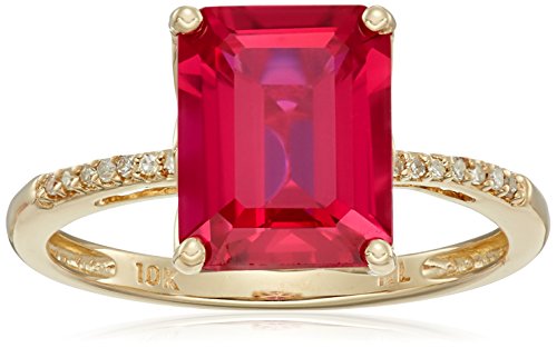 10k Yellow Gold Emerald Cut Created Ruby with Diamond Accent Ring, Size 7