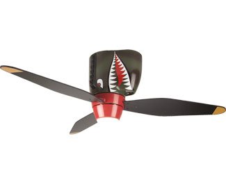 Bring a little aviation-inspired magic home with help from Craftmade's WB3448TS Tiger Shark Warplane ceiling fan. As suited to a war historian's hobby room as it is to a playroom or little pilot-to-be's bedroom, the fixture's painted design dramatically depicts the fiery-eyed monster that graced the P-40 fighter jets used during WWII. The fan's triple "warplane" blades operate on a reversible three-speed 153-by-12mm motor for optimal air movement, while their rich wood finish and painted tips lend additional credibility to the fan's historical accuracy. Furthermore, the unit includes an integrated light kit, whose single 60-watt candelabra bulb casts a warm, ambient glow suited to everything from model airplane building to cuddling up with a favorite aviation tale. Additional highlights include a flush-mount design that works in even the coziest of spaces, as well as a hanging pull chain for simple operation. A fun alternative to traditional globes or table lamps, the ceiling fan measures 48 inches in diameter by 17 inches high and carries a 30-year limited motor warranty.