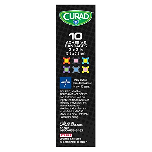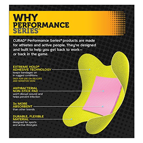 At the game, the gym or on the trail, Curad Performance Series Bandages won't quit. These bandages feature extreme hold adhesive technology. Tough, heavy duty fabric offers outstanding protection that is also breathable and flexible. The antibacterial wound pad material is three times more absorbent than most other leading brands and helps prevent infection. Not for use on delicate and sensitive skin.Feature