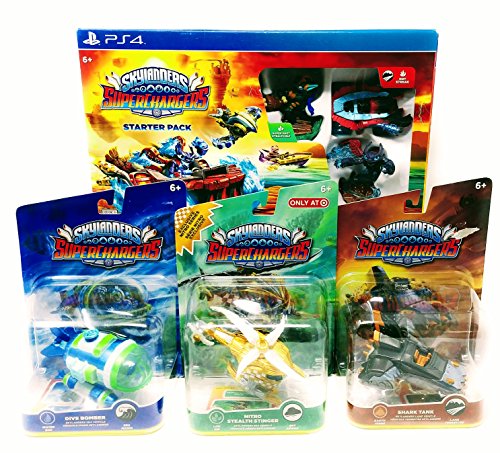 -. Binding : Video Game -. EAN : 0642892950133 -. ESRBAgeRating : Everyone 10+ -. Feature : Skylanders Superchargers Starter Pack Includes: Video Game for PS4, Three Figures, Collection Poster and Portal of Power / Skylanders included in Starter Pack are: Super Shot Stealth Elf, Hot Streak and Spitfire / ONE: Skylander Shark Tank - Earth / ONE: Skylanders Dive Bomber - Water / ONE: Skllanders Nitro Stealth Stinger - Life -. HardwarePlatform : PlayStation 4 -. Label : Missing Link Connections -. Manufacturer : Missing Link Connections -. ProductGroup : Video Games -. ProductTypeName : CONSOLE_VIDEO_GAMES -. Publisher : Missing Link Connections -. Studio : Missing Link Connections -. Title : Skylanders Superchargers Starter Pack Includes Three Figurines Portal PLUS Three Additional Figures for PS4 -. UPC : 642892950133