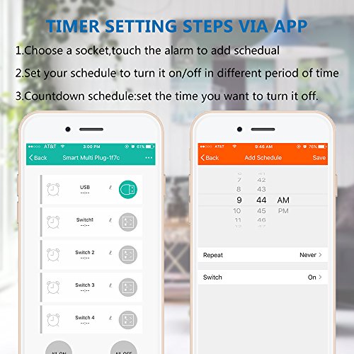 - ★Schedule with timing function:Set your own timer via App of the appliances,make it ON/OFF exactly the timing you need it to be.e.g lights On when you are home,Off when you asleep and when you are not home lights on and off with the timer to avoid thieves.If you want a countdown,you can set the time to turn things off.