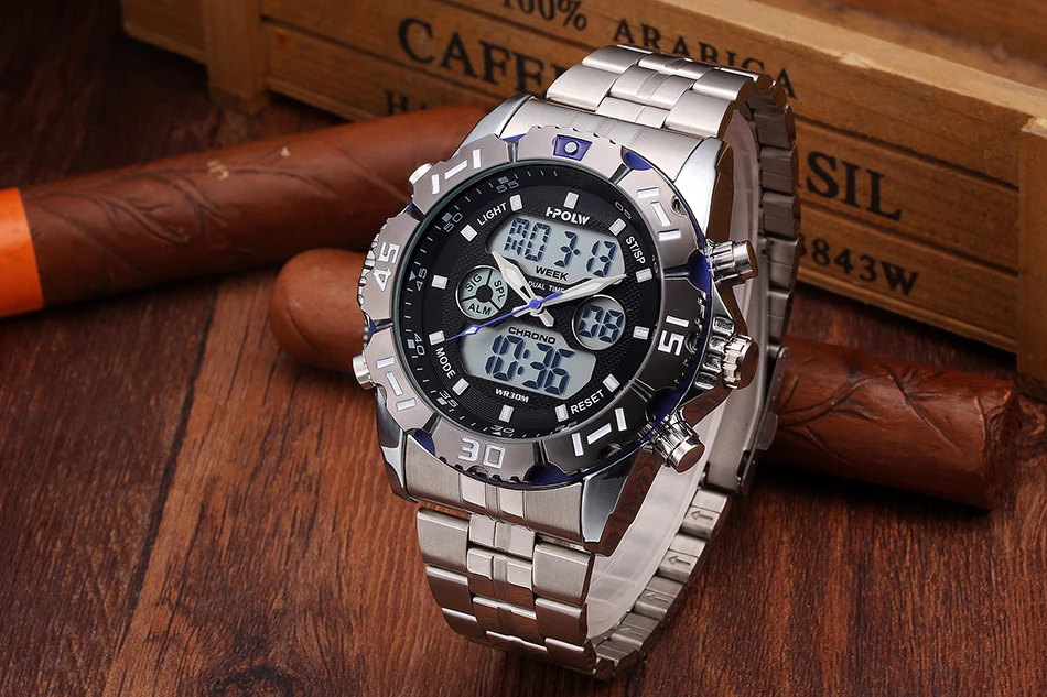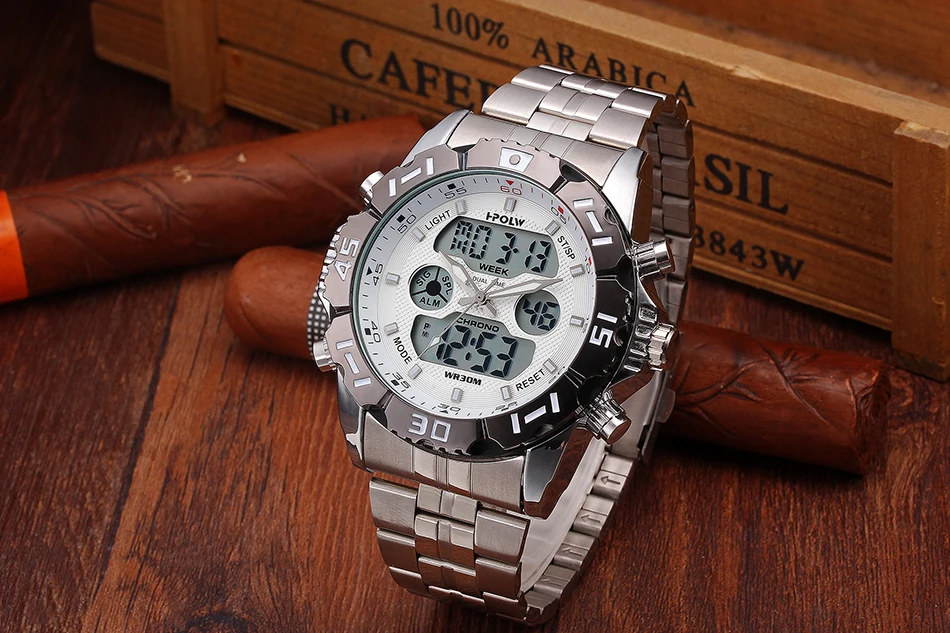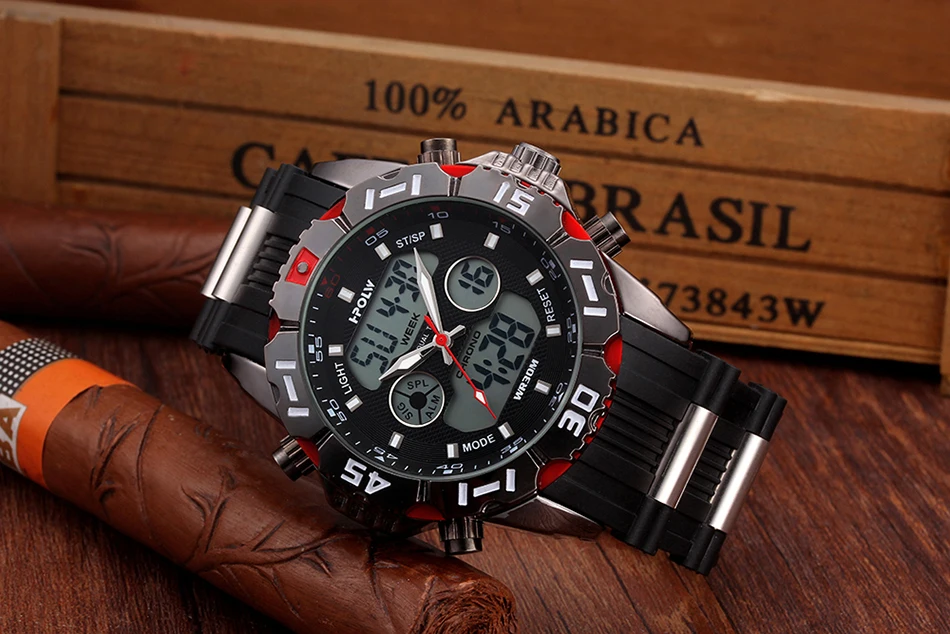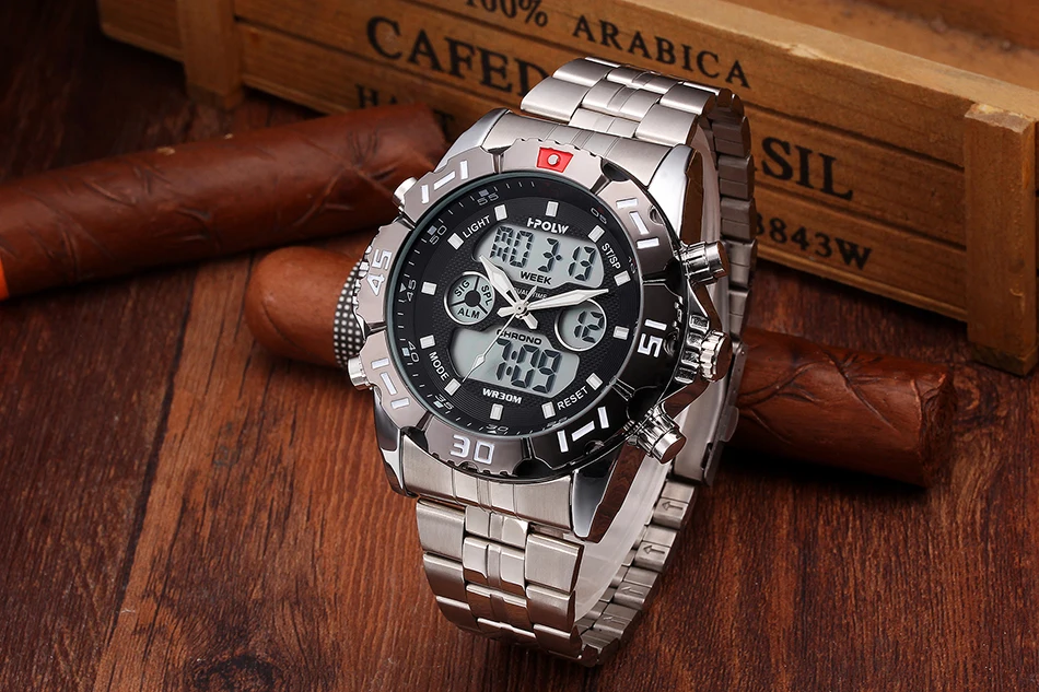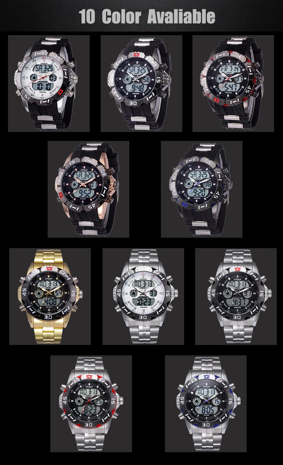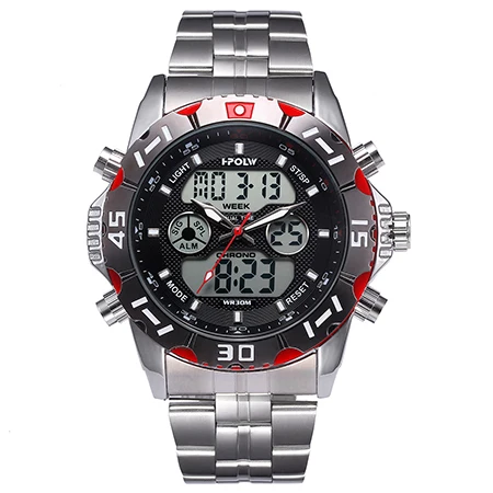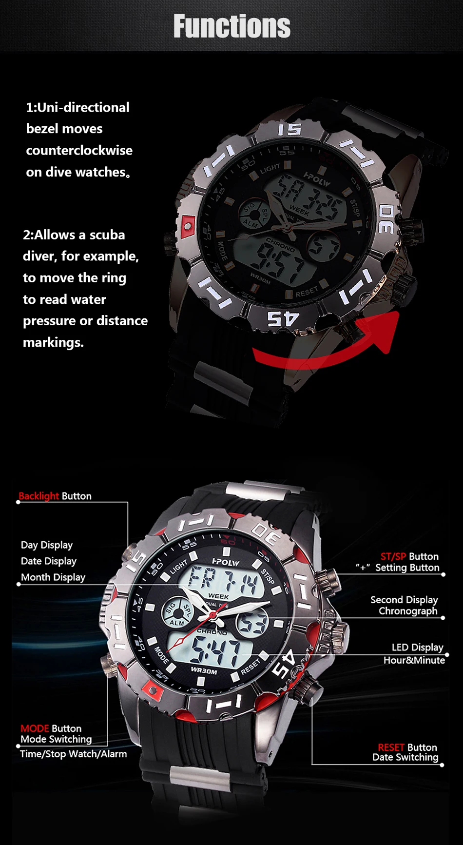 Feature:Complete Calendar,Shock Resistant,Luminous Hands,Stop Watch,LED display,Anti-magnetic,Auto Date,Water Resistant,Back Light,Chronograph,Multiple Time Zone,Alarm