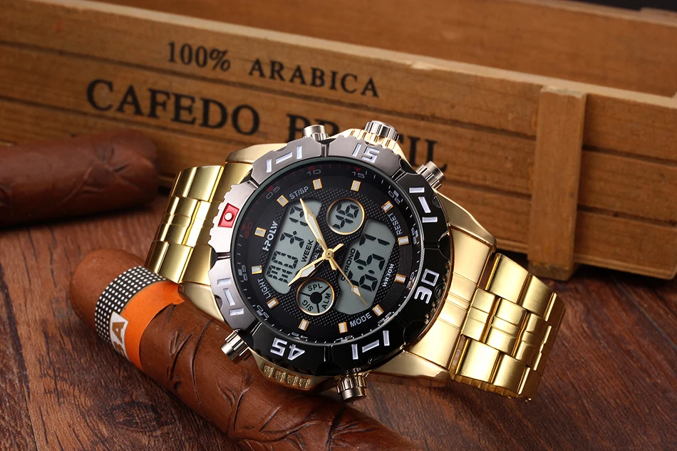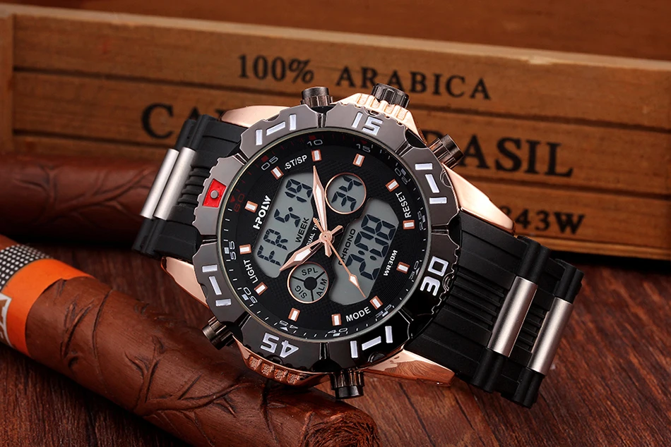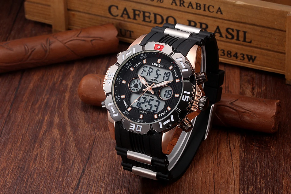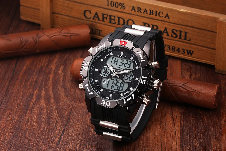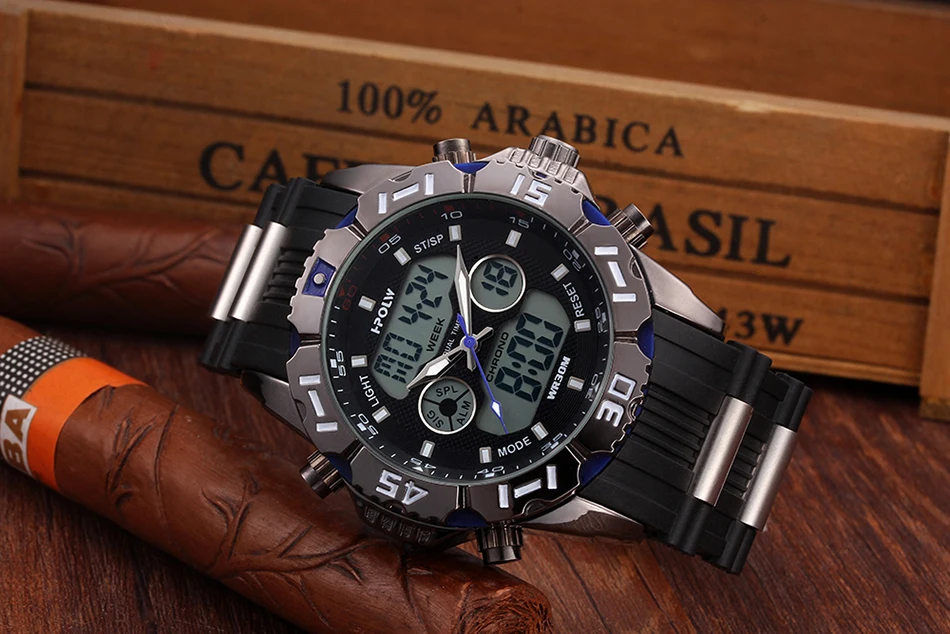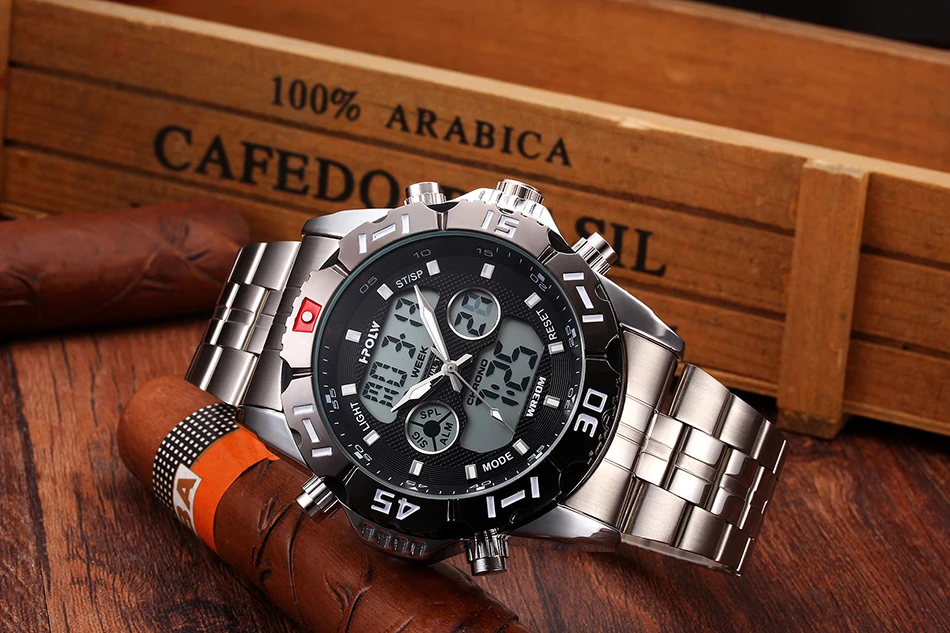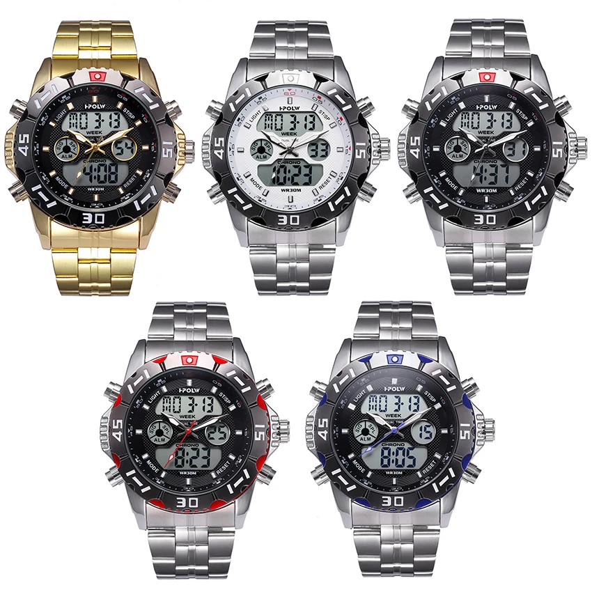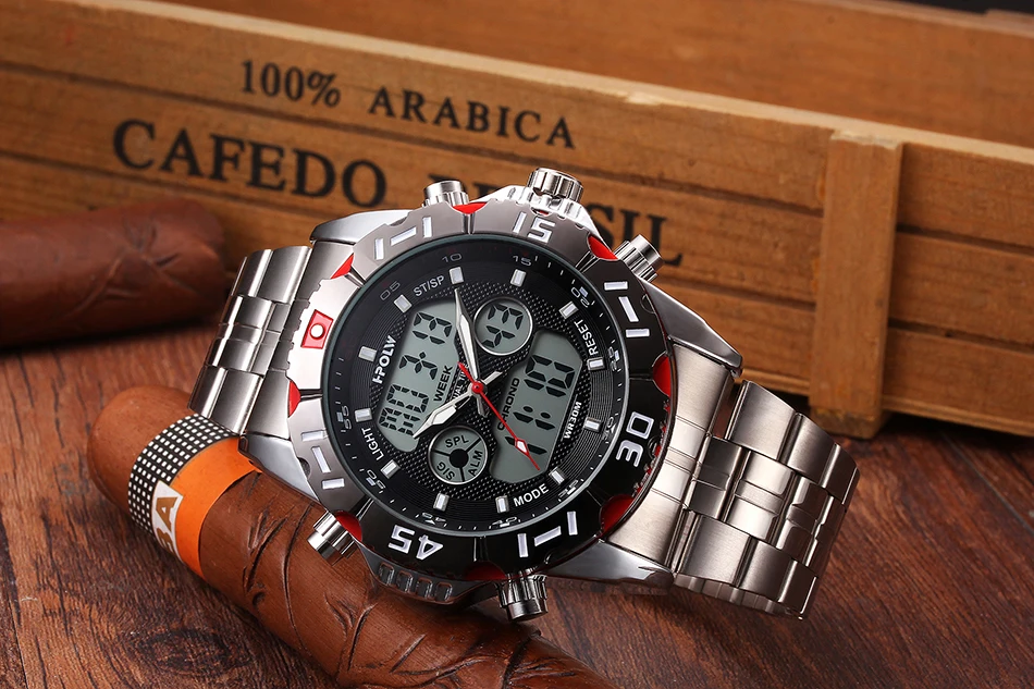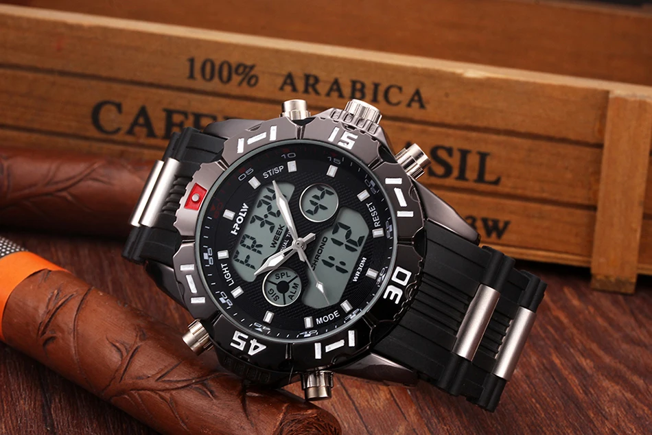 Feature:Complete Calendar,Shock Resistant,Luminous Hands,Stop Watch,LED display,Anti-magnetic,Auto Date,Water Resistant,Back Light,Chronograph,Multiple Time Zone,Alarm