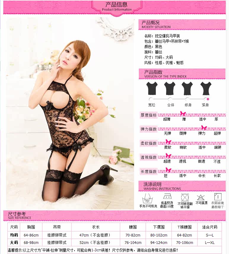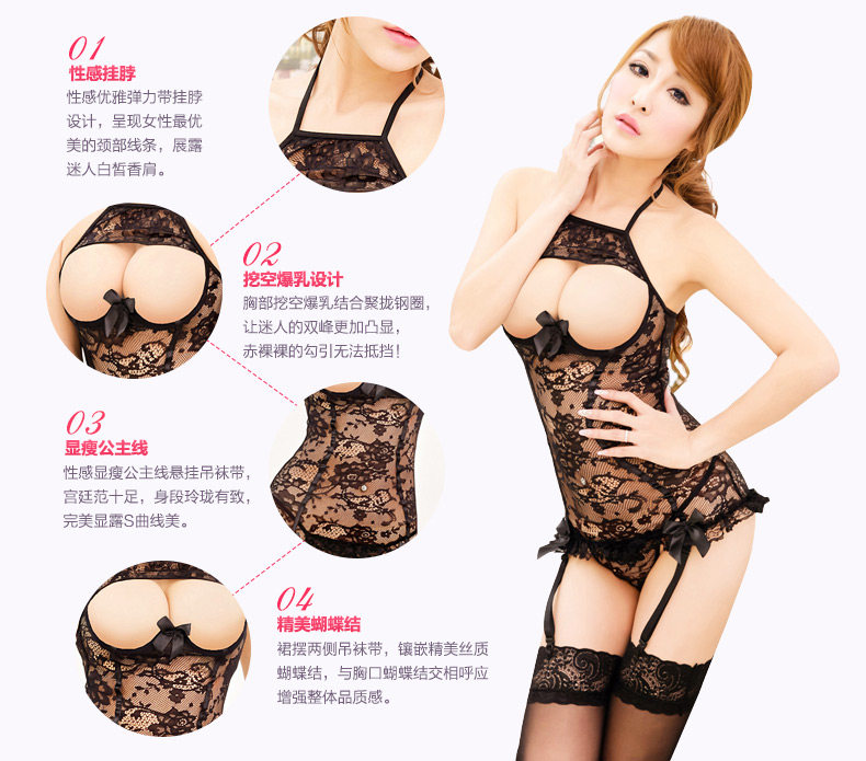 Xiao Bian said: people want to find out the black, sexy tied Halter, adjustable, do not worry about the size of the problem, oh. Chest chest a design at the lower chest with a playful bow, the temptation to extend infinite, let him have agonistic impulse. Lace flowers interwoven charm, this time to you, than flowers Johnson. Hem with three-dimensional lace, hanging stockings garters connection sultry, sexy interpretation of the full.