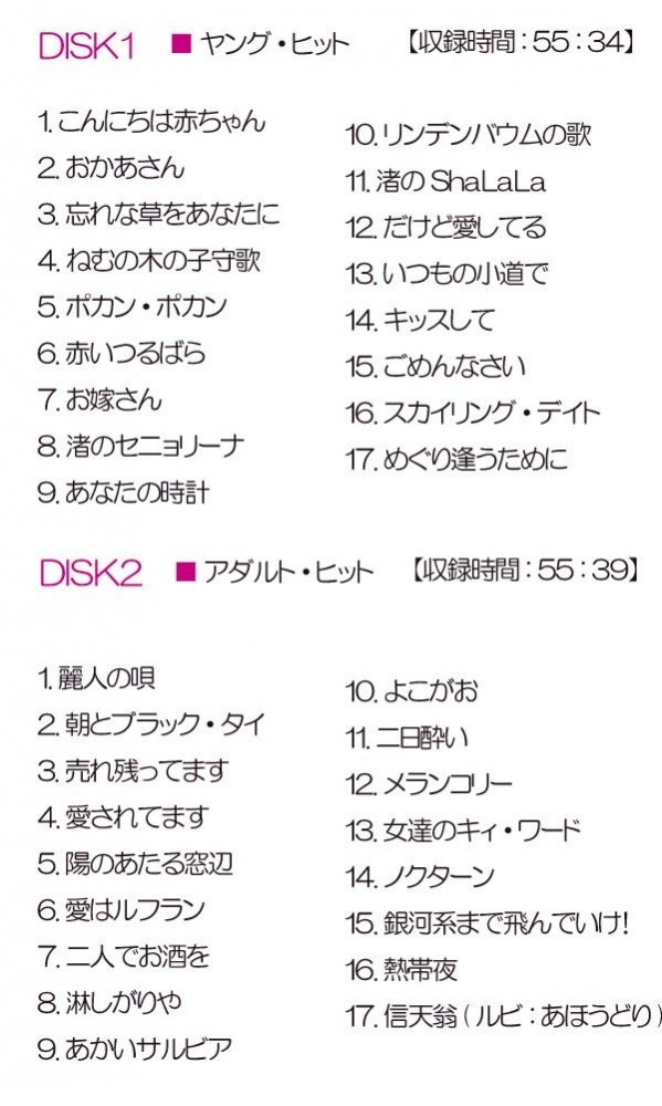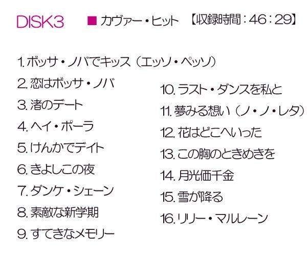 | セット内容 | 【CD3枚組(全50曲)】 DISC1 ヤング・ヒット(17曲) DISC2 アダルト・ヒット(17曲) DISC3 カヴァー・ヒット (16曲) 歌詞集 |