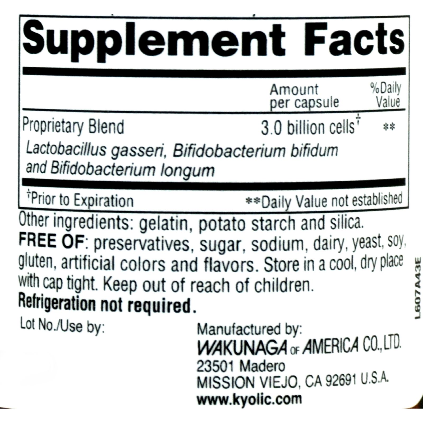 | Kyolic Kyo-Dophilus One Per Day Description: Promotes Healthy Intestinal Function Probiotic Supplement One Per Day 3 Billion Live Cells Per Capsule Kyo-Dophilus One Per Day is formulated with three specially cultured, non-dairy, heat-stable, stomach acid resistant strains of beneficial bacteria in a convenient one-per-day capsule. This friendly Trio gives you relief from the inconvenience caused by bad bacteria. Take Kyo-Dophilus during and after a cycle of medication, when you travel, and everyday to boost immunity, promote healthy intestinal function and general well-being. Free Of preservatives, sugar, sodium, milk, yeast, soy, gluten, artificial colors and flavors. Disclaimer These statements have not been evaluated by the FDA. These products are not intended to diagnose, treat, cure, or prevent any disease. Ingredients : L. acidophilus, B. bifidum, and B. longum, 3.0 billion cells (prior to the expiration date). OTHER INGREDIENTS: Vegetable starch complex (potato starch and silica). Gluten Free : Yes Size : 30 CAP Pack of : 1 Product Selling Unit : each |