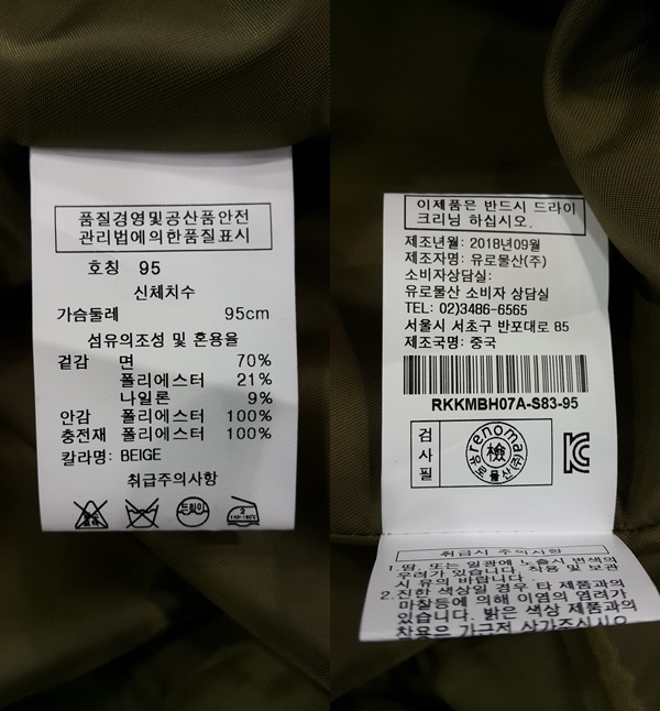 겉감 면 70% 폴리에스터 21% 나일론 9%