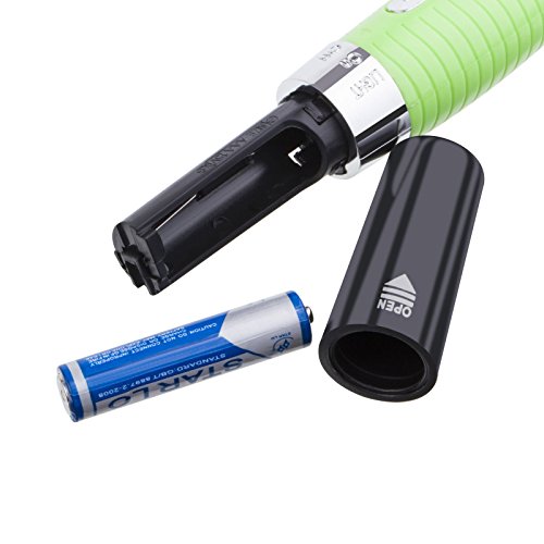 Feature : German made stainless steel blades. Built-in LED light. Rubber non-slip grip. / Powered by one AAA battery INCLUDED. Compact design, easy to carry. 2 comb attachments for trimming eyebrows/mustaches. / The 6mm Comb is for trimming longer eyebrows/mustache hairs. The 2mm/4mm Comb is for trimming shorter eyebrows/mustache hairs. / Note: Water will cause damage to your Trimmer. Do not use Trimmer in a damp room or near water. When not use, be sure the trimmer is turned off. / Color Black Green Package includes: 1 x Personal Hair Trimmer 2 x Comb 1 x Cleaning Brush 1 x English manual Brand New