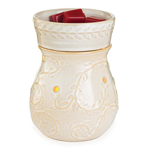 - This ivory-colored reactive glaze warmer is accented with organic vines
