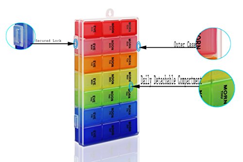 Eliminate confusion: great reminder for all ages. It will help you to organize twice a day, 3 or 4 times a day pills with our daily compartment. Colors and letters help distinguish days of the week. Translucent organizer will be able to see whether you take your pills in time or not without opening the lid.