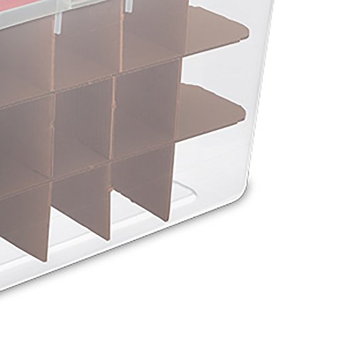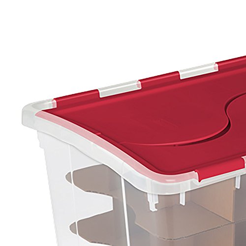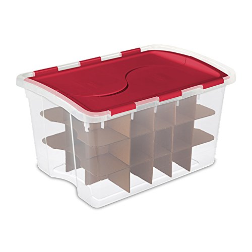 Studio : Sterilite Publisher : Sterilite Binding : Kitchen Product Description Keep that collection of holiday decorations and Christmas tree ornaments safe and organized in the off season with the help of the Sterilite Christmas Ornament Storage Box. This handy 48 quart capacity storage container safely secures up to 45 ornaments, features a hinged lid for easy access, integrated handles for easy carrying, and a see-through base for easy identification of contents. Its durable plastic construction keeps ornaments safe and secure while in storage. With the Sterilite Christmas Ornament Storage Box, your ornaments will look great year after year. 0