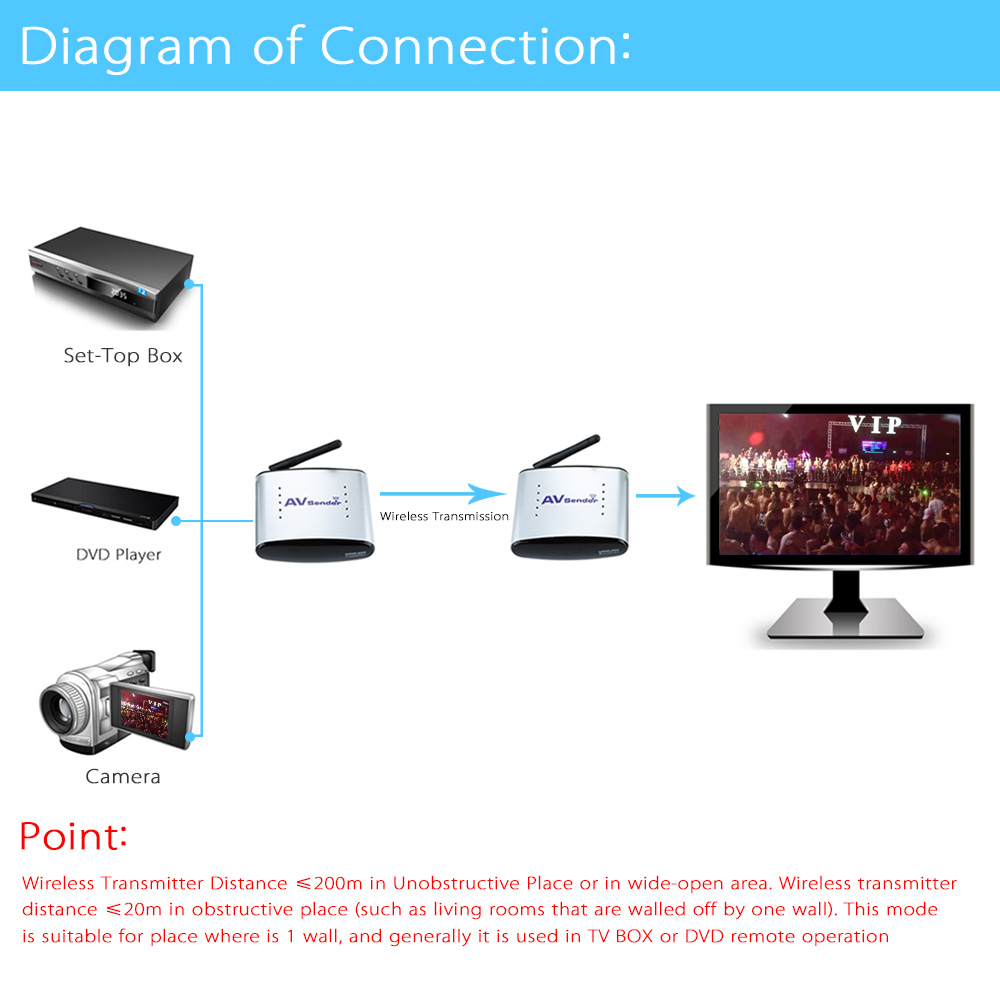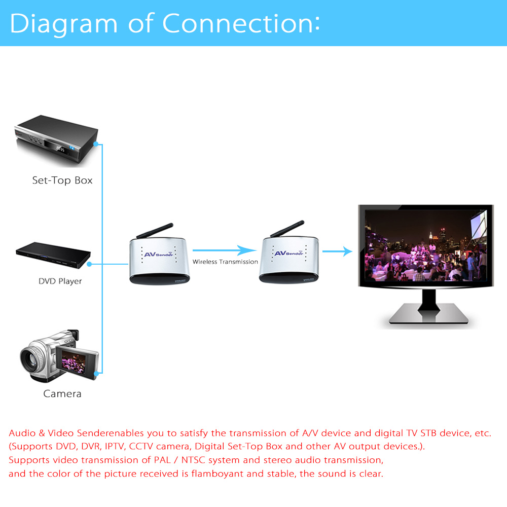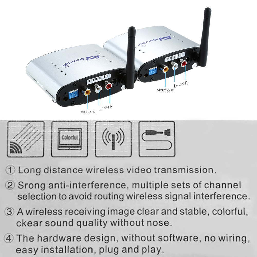 The Wireless AV Sender Transmitter !#!amp!*! Receiver is a kind of electronic product, which can realize the audio !#!amp!*! video signal sharing in different rooms for family entertainment. It consist of a Transmitter and Receiver. Adopting advanced 2.4G GHz / 5.8GHz Wireless Transmission Schemes and having advantages of long distance transmission, strong anti-interface and high mobility. By means of radio waves, it can transmit the signal from DVD player, DVR, CCTV camera, IPTV, Digital TV Set-Top Box !#!amp!*! other AV devices at Transmitter end to TV Sets in different room at Receiver end. So that you can enjoy freely wireless HD AV Sharing Data and HiFi audio and video effect. The item Support 8 groups of channels, and you can select these channels to avoid interference from signals of a wireless router, etc.