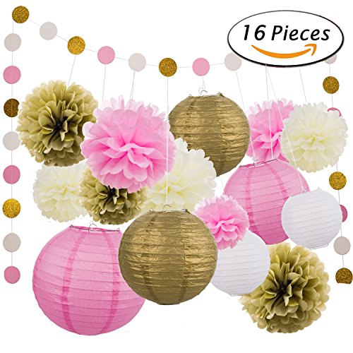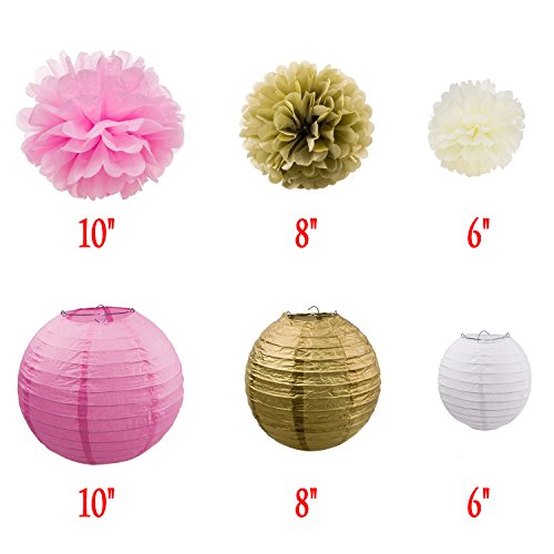 - PACKAGE INCLUDES – 16pcs party decoration includes 9 pcs tissue paper flowers in 3 sizes and 6 pcs paper lanterns. It also contained a 10 feet circle dot paper garland (pink white gold). This party decoration set is perfect to spice up, decorate, and impress at any event