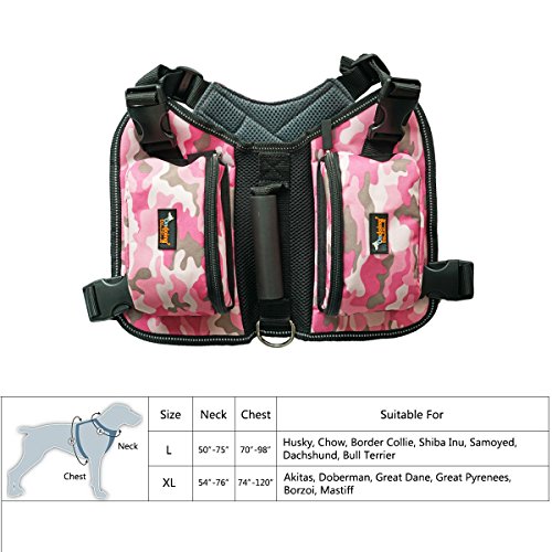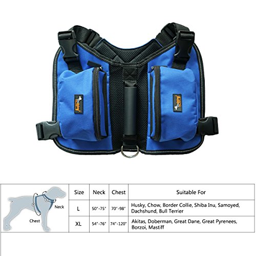 -. Feature : Dimensions: L-neck: 60-80cm, chest: 88-100cm; XL-neck: 70-90cm, chest: 100-124cm / Made of Oxford cloth, high-qualified, strong and durable. Expandable pockets, D-ring leash attachment, reflective webbings. / Adjustable straps, mesh harness provides maximum fit, breathability and comfortability. / A lot of space for snacks, water bottles, keys, cellphone, etc. / Great choice for walking, shopping, training, hiking and camping.
