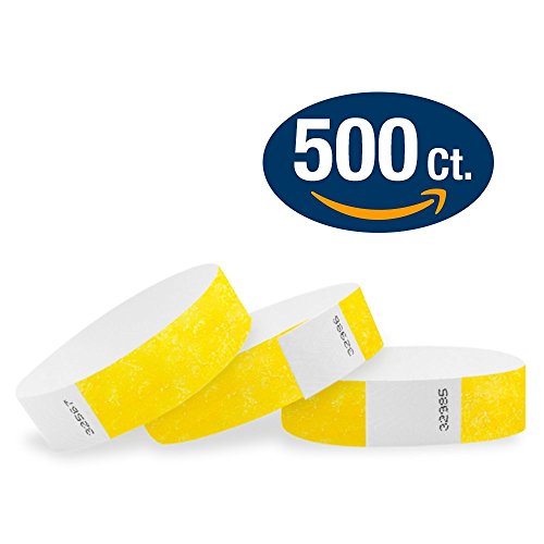 500 PANTONE YELLOW 3/4 INCH TYVEK WRISTBANDS FROM WRISTCO - The 500 wristbands are packaged in sheets of ten. Each wristband measures 3/4 inches wide by 10 inches long and will fit most wrists. Each armband is numbered for security and identification.