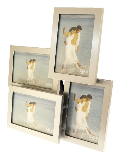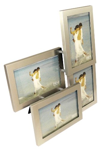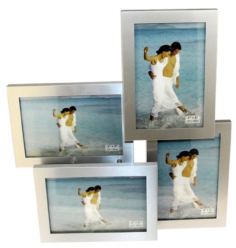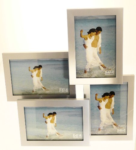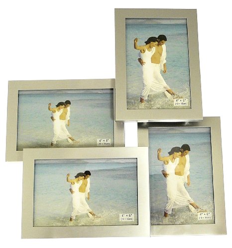 Brushed Aluminium Satin Silver color 4 Picture Multi Aperture Photo Frame Gift - Holds 4 photographs. The frame takes 4 standard 4 x 6 inch (10 x 15cm) photos: 2 landscape and 2 portrait and looks smart and is a novelty photo frame which would look great around the home and adds to the decor.