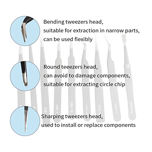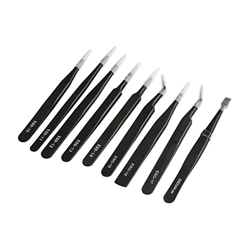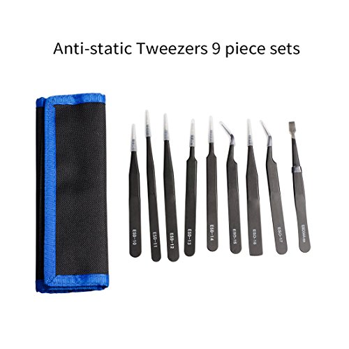 Wolfwhoop ESD-9 Precision Anti-static ESD Stainless Steel Tweezers Set for Electronics, Jewelry-Making, Laboratory Work, Eyebrow & Ingrown Hair Removal, DIY Repair, Handwork- 9pcs