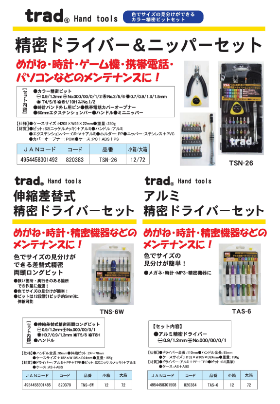 ●色でサイズの見分けができるアルミボディ精密ドライバー●セット内容 アルミ精密ドライバー(全長110mm) ‐0.9/1.2mm/+000/+00/+1