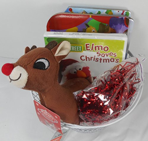 -. Title : Children's Toy Gift Basket -Small Stuffed Rudolph Doll, Puzzle of US, Elmo Saves Christmas DVD, Three Christmas Pop Up Books, White Wire Basket w/Foil Shreds for Decoration Bundle