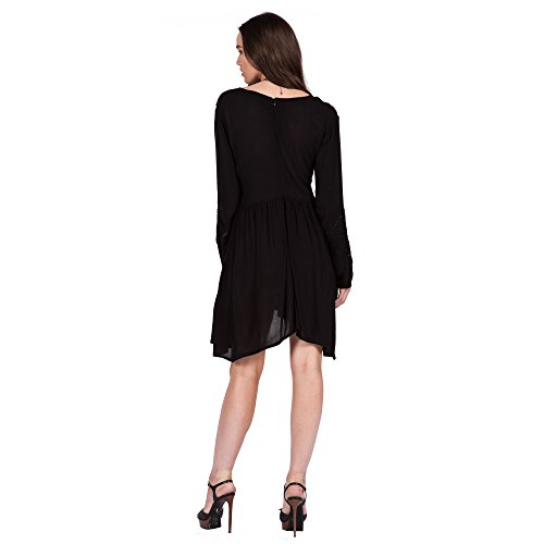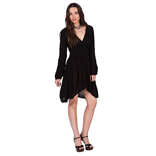 Studio : Volcom Juniors Publisher : Volcom Juniors Binding : Apparel Product Description Dark and mysterious moments call for the vampish allure of the nightscape dress. Styled as a long sleeve mini, with a plunging neckline, a full and drapey skirt, bellowed sleeves, and crochet detailing throughout. 0