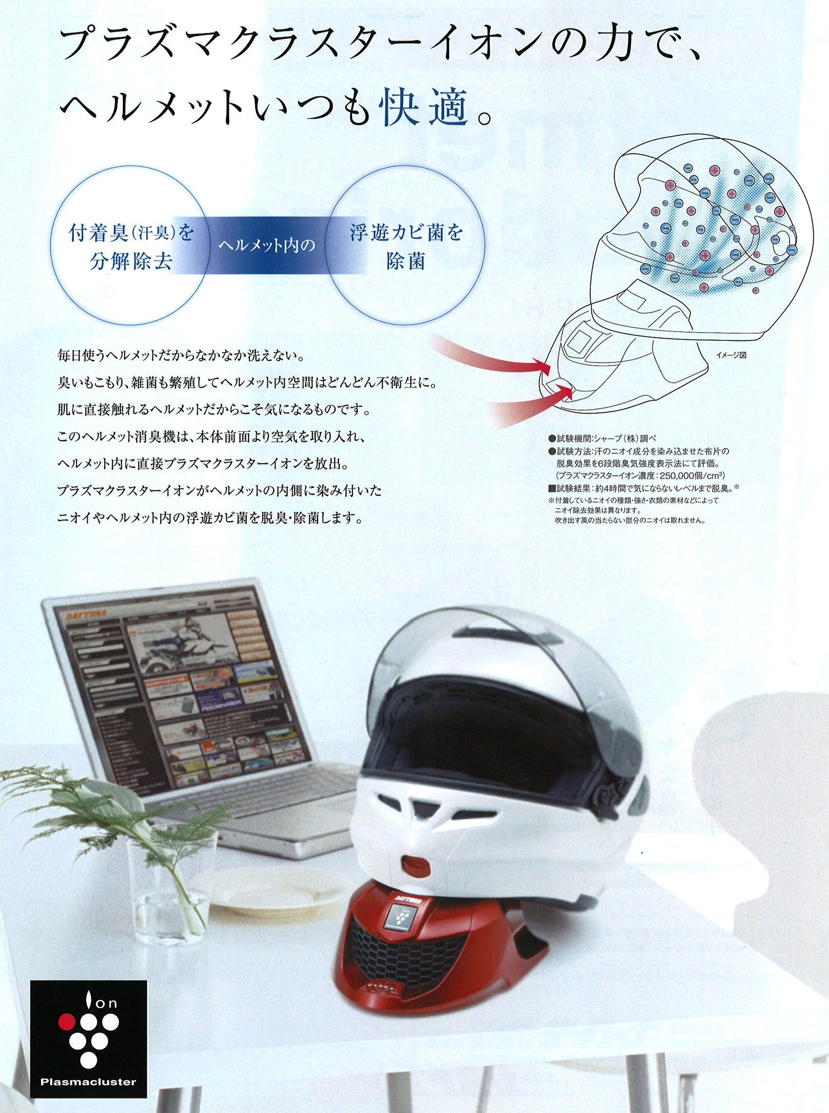 In the case of a helmet deodorizer, plasma cluster ions hit intensely within the helmet, so that sweaty odors and tobacco smudges are deodorized in about 8 hours.